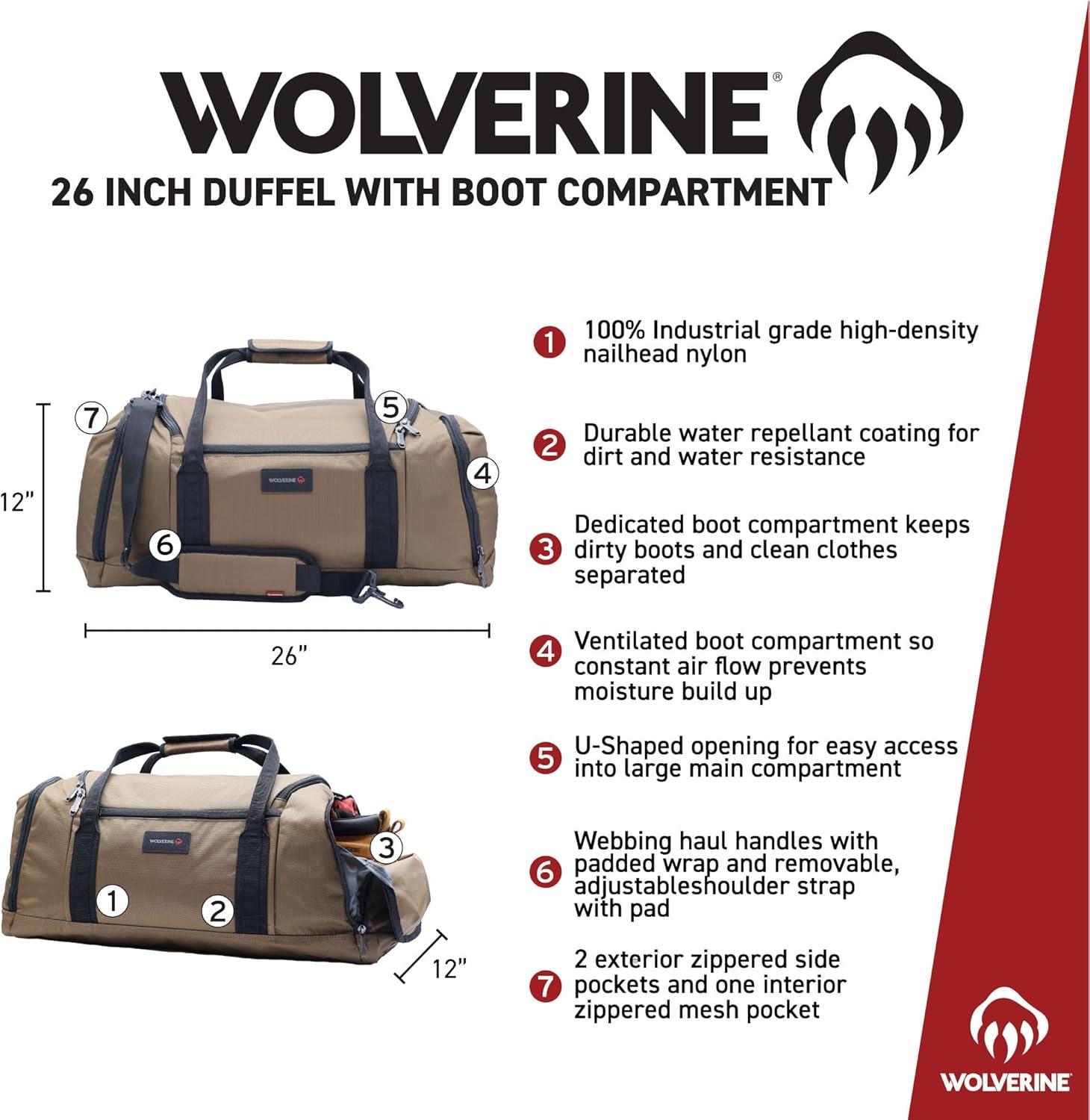 WOLVERINE 26″ Duffel with Ventilated Boot Compartment, Water & Dirt Resistant, Gunmetal, One Size(Chestnut)