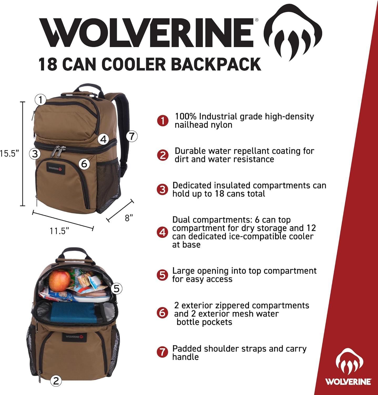 • Wolverine 36 Can Cooler Backpack with Durable Nailhead Nylon, Dual Compartment Cooler & Dry Storage, Padded Mesh Back Panel, & Exterior Water Bottle Pockets(Chestnut)