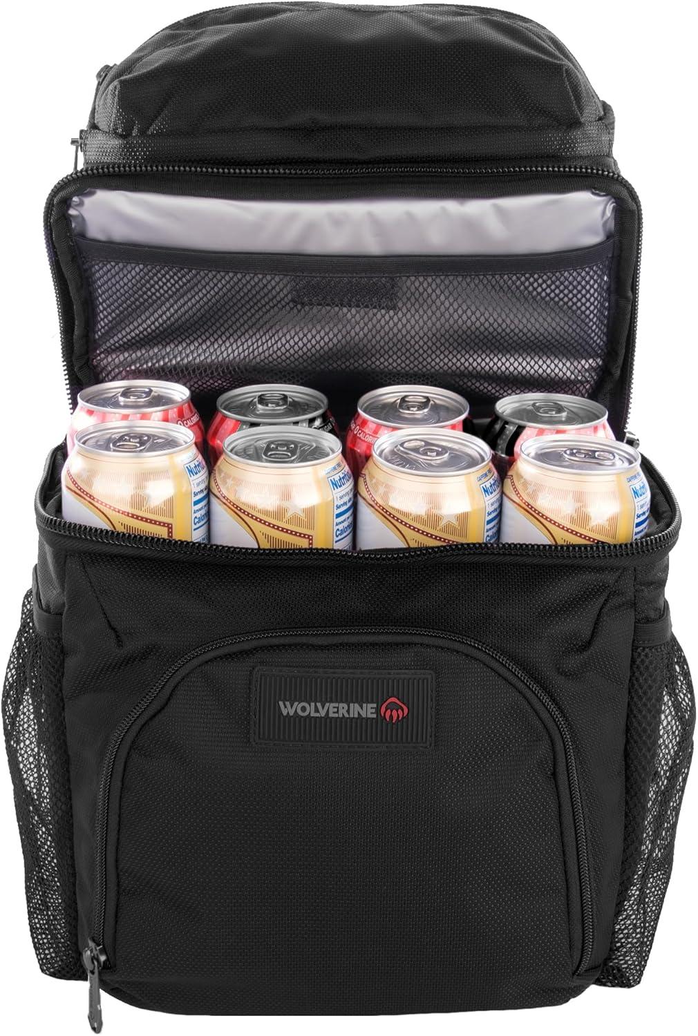 • Wolverine 36 Can Cooler Backpack with Durable Nailhead Nylon, Dual Compartment Cooler & Dry Storage, Padded Mesh Back Panel, & Exterior Water Bottle Pockets(Black)