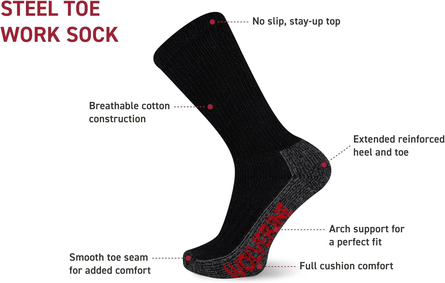 • Wolverine Men’s Steel Toe Cotton Work Boot Crew Socks – 2 Pairs – Durable Cushioning(Black)